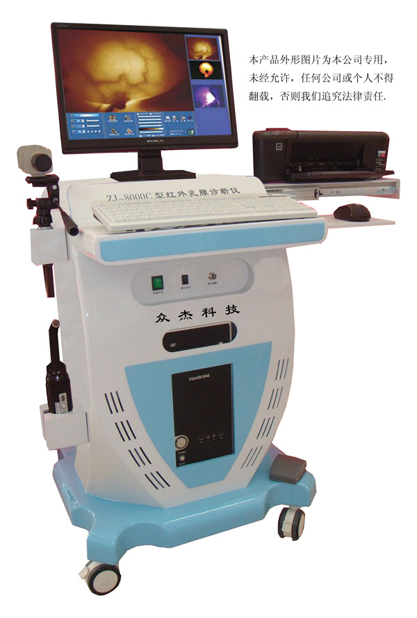 紅外乳腺診斷儀是由推車、主機(jī)、顯示器、探頭、攝像頭和打印機(jī)等部件組成主要應(yīng)用于人體乳腺組織的紅外透照檢查。儀器軟件在Windows中文操作系統(tǒng)下可實(shí)現(xiàn)圖像采集、顯示、處理、儲存和打印輸出的一體化管理,支持病員的資料編寫,生成的圖文報告單格式有助于醫(yī)生借助圖像向病人說明檢查部位受損程度以及治療方法。